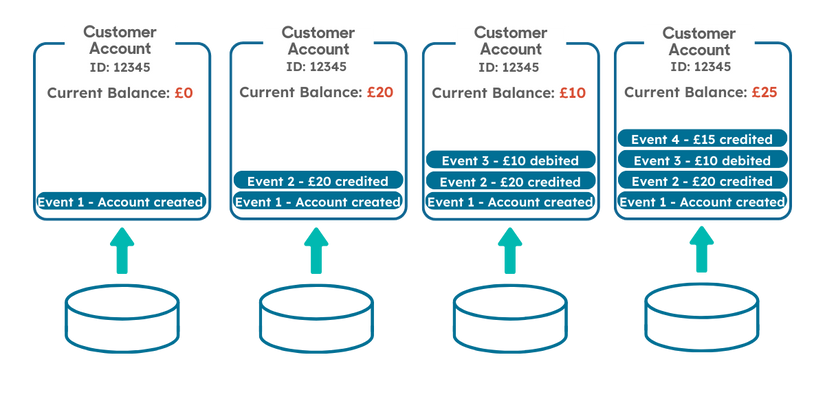 Event Sourcing is an Architectural Design pattern which offers an alternative approach of storing the changes to the ledger.  Rather than storing the current state (Balance, Transactions etc) in an account master and Transaction detail tables, as has traditionally been done, Event Sourcing states that all changes of state are stored as immutable events against the account.  In this alternative model, querying the balance would mean processing the historic events and evaluating them in chronological order on demand, thus avoiding any synchronisation issues in the relational model.  The following diagram shows how these events will be stored against our Ledgers.