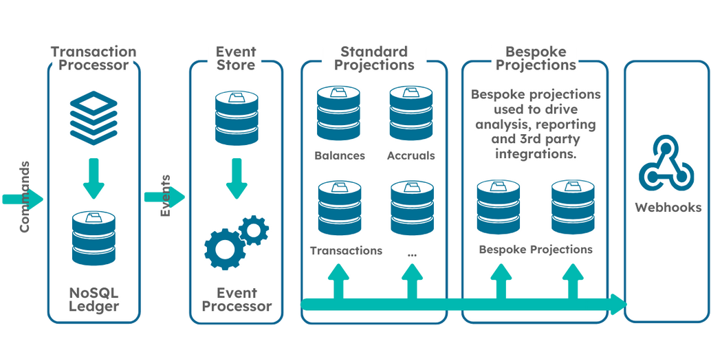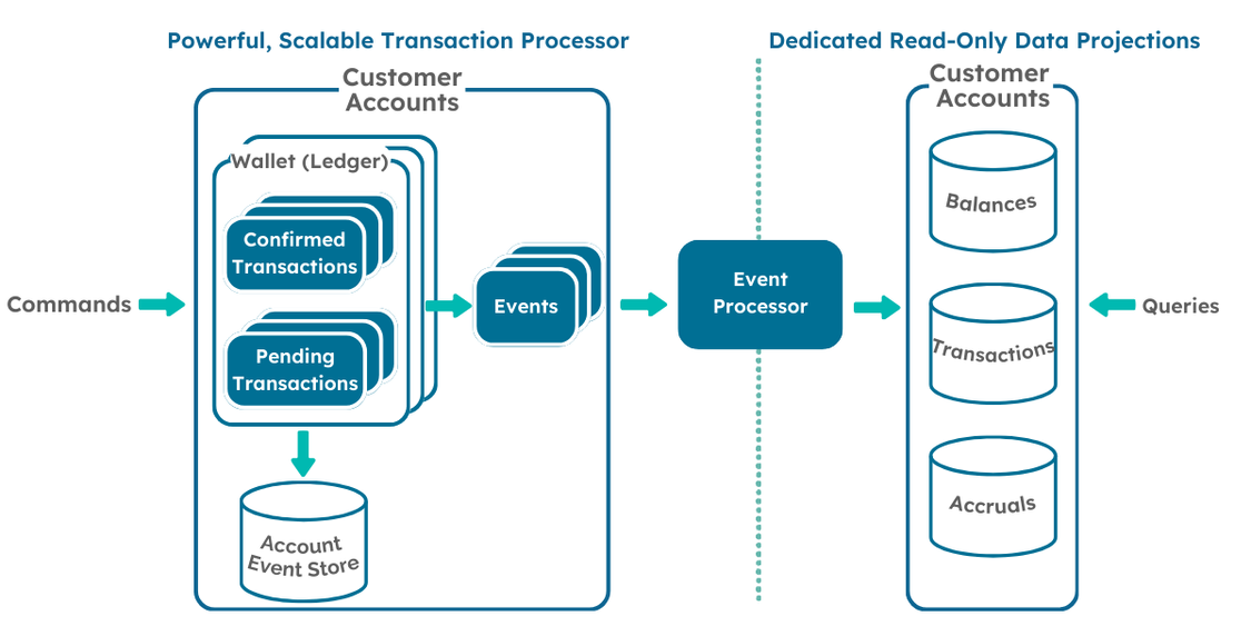 So, in summary, our CQRS based platform will have separate services and databases for commands and queries that are independently scalable.   The command side will include a Transaction processor service that will process commands against the ledgers, querying the Event Store on demand for validation (Balances, Accrued Interest, Fees etc) and writing state change events to the event store which will be a NoSQL database to avoid data truncation.  These Events will be published for other subscribers (both internal and external).  Query services will be created to derive balances, transactions and other financial information by processing these events either on demand or by consuming the events as they happen to populate a relational database.  Webhooks will be created for these events which External systems can elect to subscribe to (via endpoint configuration).