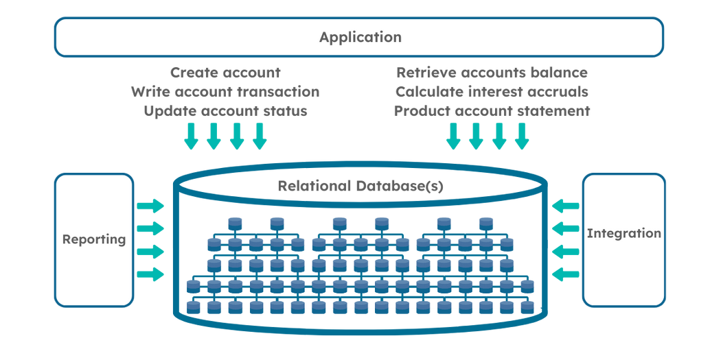 Traditionally, core banking solutions were built around one single relational data model that is used for all read and write (CRUD) operations. It was simple to implement and was historically the way all mainframe systems were developed as it works well for basic CRUD operations. Over time though, core banking solutions have been become more and more complex due to banking moving from being purely branch based to multi-channel, and this single database approach has now become unwieldy.